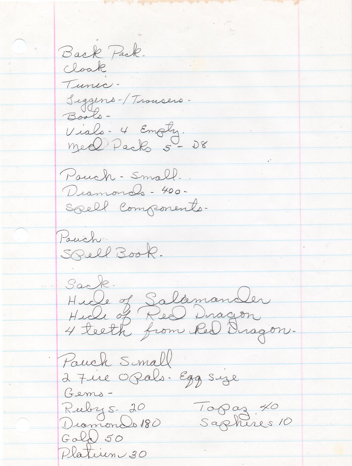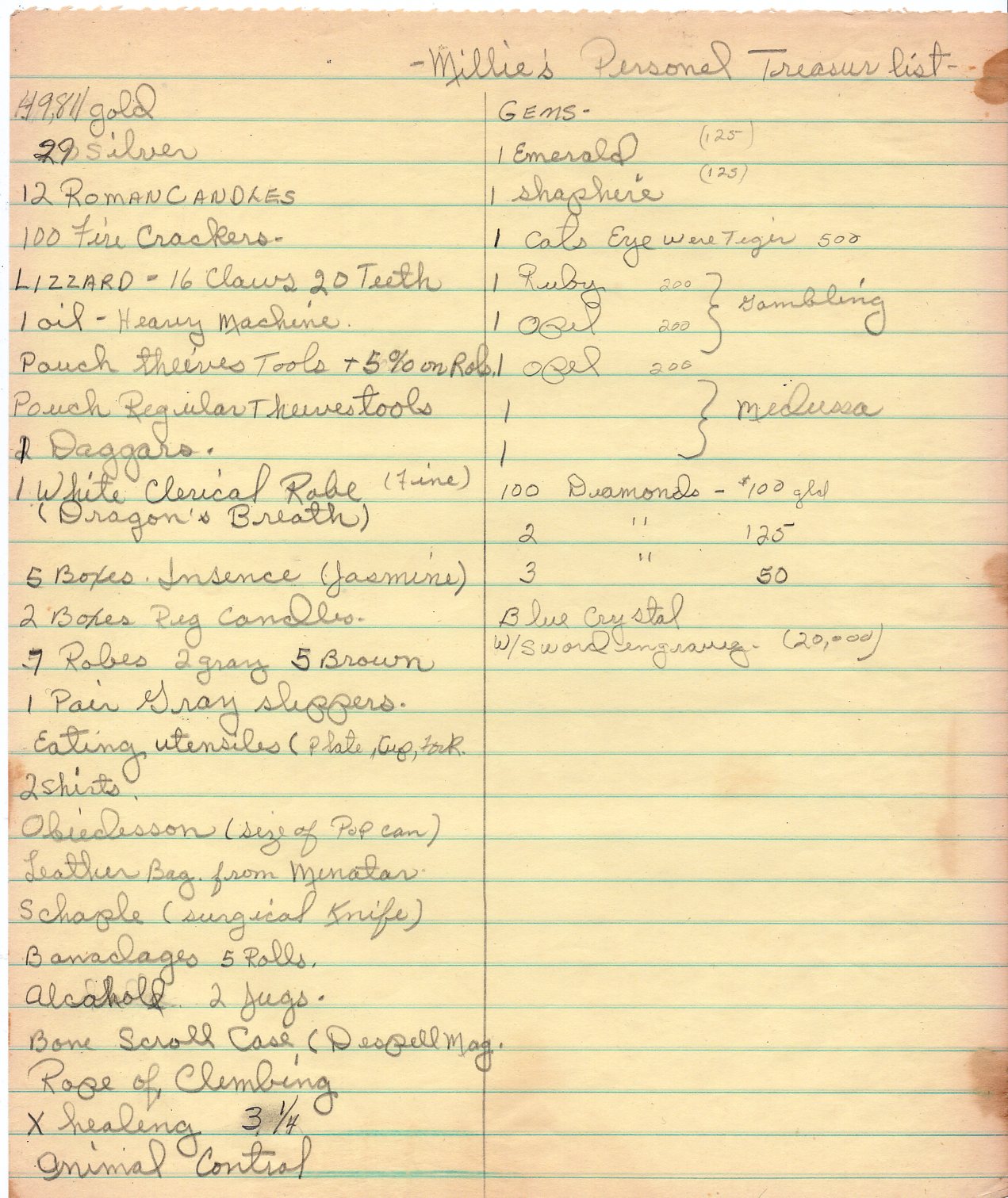 These seem quite old and are probably from the mid 1990s. One of the notes (Amulet of Seeing) is certainly from a game master, giving a magic item to her as a player. Our old Dragonlance GM, Jim Miklos, used to do this, so it might be his handwriting. That would certainly date the note itself to being late 1980s to early 1990s (depending on when she continued to play with Jim’s group).
