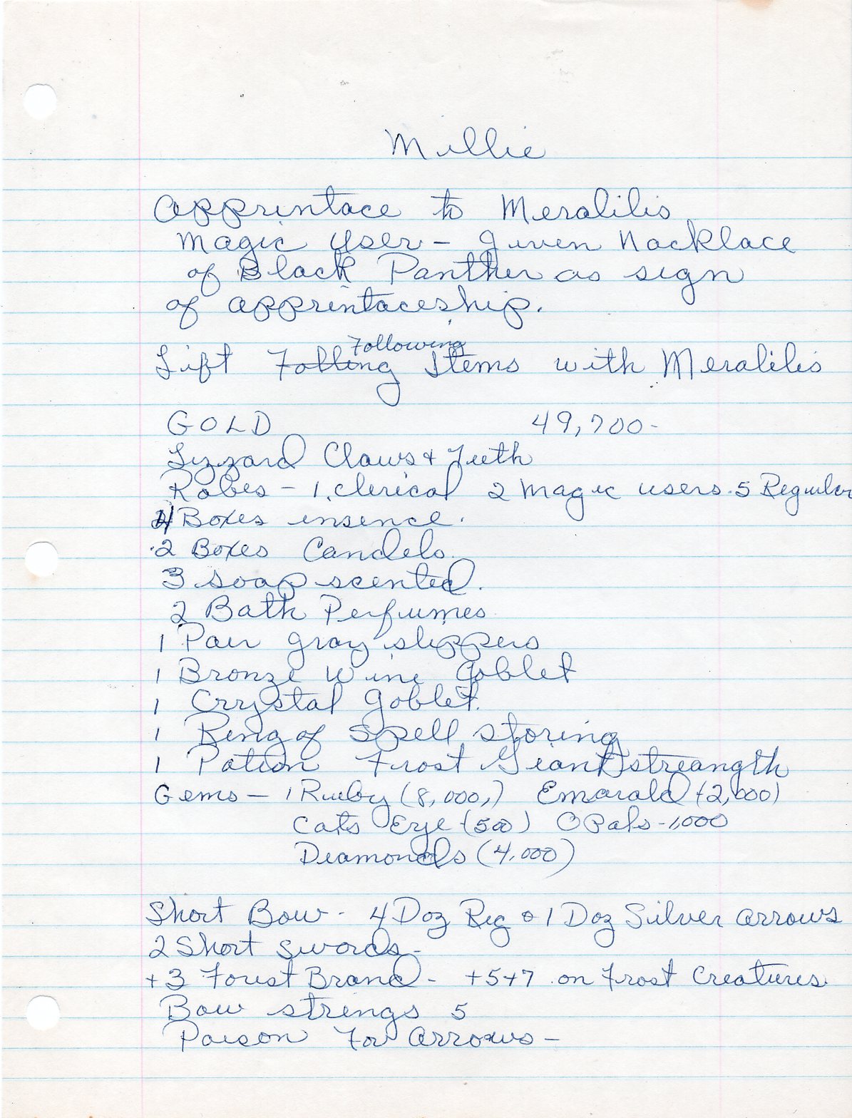 Apprentace [sic] to Meralilis Magic user – given necklace of black panther as sign of appreintaceship [sic]